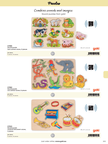 2434 013594 5752014 013594 5786224 013594 5789501+1+1+30 x 21 x 2,4 cm30 x 21 x 2,4 cm30 x 21 x 2,4 cmJust order online: www.goki.euPuzzlesCombine sounds and images: Sound puzzles from goki!57520Sound puzzle musical instrument voices, 5 pieces57862Sound puzzle zoo animal voices, 6 pieces57895Sound puzzle farm animal voices, 8 piecesper piece6 pieces | 24 piecesper piece6 pieces | 24 piecesper piece6 pieces | 24 pieces