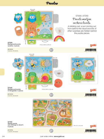 2444 013594 5733994 013594 5734054 013594 5774961+1+2+21,8 x 22,5 x 2,8 cm21,8 x 22,5 x 2,8 cm30 x 21 x 2,4 cmJust order online: www.goki.euPuzzles57339Background puzzle weather, 4 pieces57340Background puzzle In the garden, 4 pieces57749Sliding puzzle who belongs to whom?, 8 piecesper piece8 pieces | 32 piecesper piece8 pieces | 32 piecesper piece7 pieces | 28 pieces57339 + 57340Puzzle and fun on three levels.A blinking owl, a sun coming out from behind the cloud and lots of other surprises are hidden behind the puzzle pieces.