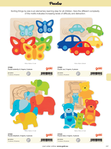 2472+2+2+2+4 013594 5745014 013594 5748604 013594 5744954 013594 57485317,5 x 13,5 x 1,6 cm13,5 x 17,5 x 1,7 cm17,5 x 13,5 x 1,7 cm17,5 x 13,5 x 1,7 cmJust order online: www.goki.euPuzzlesSorting things by size is an elementary learning step for all children. Here the different complexity of the motifs indicates increasing levels of diffi culty and distraction.57450Puzzle elephant, 5 layers, 5 pieces57486Puzzle butterfly II, 5 layers, 5 pieces57449Puzzle bear, 5 layers, 5 pieces57485Puzzle car, 5 layers, 5 piecesper piece12 pieces | 48 piecesper piece12 pieces | 48 piecesper piece12 pieces | 48 piecesper piece12 pieces | 48 pieces