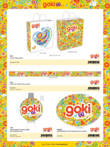 234 013594 007931 4 013594 6690474 013594 0080374 013594 00843336 x 12 x 41 cm100 x 3,8 cm10 cm70 x 50 cmJust order online: www.goki.eu793Shelf wobbler round goki66 with adhesive dot66904goki66 Ellipse with hanging device, plasticper set of 30 pieces | 99 pieces per piece803Carrier bag, paper843Insert for scanner bar, paperper pack of 100per piece0 pieces | 100 piecesFront side Reverse side