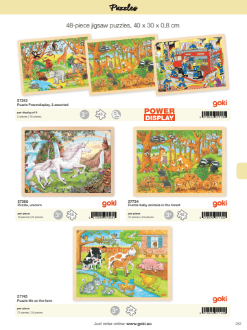 2573+ 3+4 013594 573665 4 013594 57734248 484 013594 5731393 4 013594 577458+ 483+ 48Just order online: www.goki.euPuzzles57366Puzzle, unicorn57734Puzzle baby animals in the forestper piece12 pieces | 24 piecesper piece12 pieces | 24 pieces57313Puzzle Powerdisplay, 3 assortedper display of 90 pieces | 18 pieces57745Puzzle life on the farmper piece12 pieces | 24 pieces48-piece jigsaw puzzles, 40 x 30 x 0,8 cm