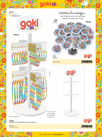 244 013594 6689894 013594 0085253,7 cm%u00ef 50 cm %u00f0Just order online: www.goki.eu66898Display for 24 bracelets and 18 necklacesper piece0 pieces | 1 piece852Buttonper set of 50Children love badges - and they%u2018re sure to love these colourful ones even more.without decorationWoodMetalThe necklacesand braceletscan be foundon page 13.