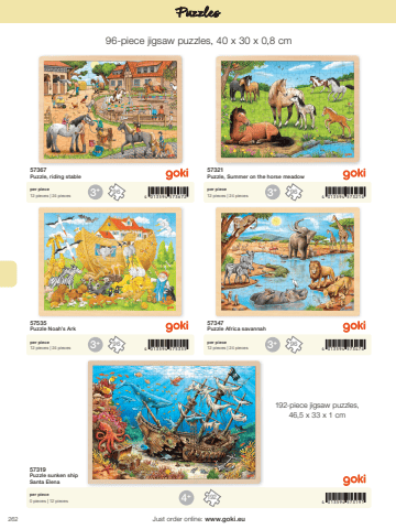 2623+3+3+3+4 013594 5736724 013594 5753554 013594 5732144 013594 573474969696964 4 013594 573191+ 192Just order online: www.goki.euPuzzles57367Puzzle, riding stable57535Puzzle Noah%u2019s Ark57321Puzzle, Summer on the horse meadow57347Puzzle Africa savannahper piece12 pieces | 24 piecesper piece12 pieces | 24 piecesper piece12 pieces | 24 piecesper piece12 pieces | 24 pieces57319Puzzle sunken ship Santa Elenaper piece0 pieces | 12 pieces192-piece jigsaw puzzles, 46,5 x 33 x 1 cm96-piece jigsaw puzzles, 40 x 30 x 0,8 cm