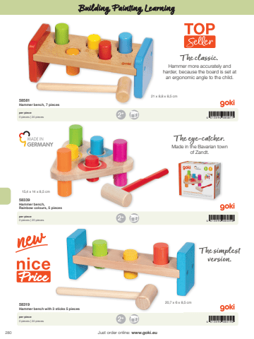 2804 013594 5831904 013594 5833984 013594 5858112+2+2+21 x 8,8 x 8,5 cm15,4 x 14 x 8,5 cm20,7 x 6 x 8,5 cmJust order online: www.goki.euBuilding, Painting, Learning58319Hammer bench with 3 sticks 5 pieces58339Hammer bench, Rainbow colours, 5 pieces58581Hammer bench, 7 piecesper piece0 pieces | 24 piecesper piece0 pieces | 20 piecesper piece0 pieces | 24 piecesThe classic.Hammer more accurately and harder, because the board is set at an ergonomic angle to the child.The eye-catcher.Made in the Bavarian town of Zandt.The simplest version.