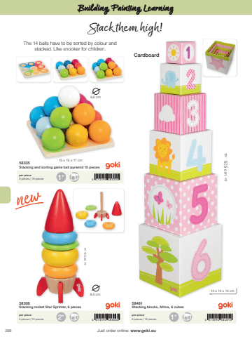 2881+2+ 1+4 013594 5833504 013594 583060 4 013594 58481415 x 15 x 11 cm4,6 cm%u00ef 57,5 cm%u00f014 x 14 x 14 cm%u00ef 19 cm %u00f08,5 cmJust order online: www.goki.euBuilding, Painting, Learning58335Stacking and sorting game ball pyramid 15 pieces58306Stacking rocket Star Sprinter, 6 pieces58481Stacking blocks, Africa, 6 cubesper piece9 pieces | 18 piecesper piece0 pieces | 12 piecesper piece6 pieces | 12 piecesStack them high!The 14 balls have to be sorted by colour and stacked. Like snooker for children.Cardboard