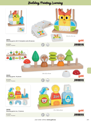 2914 013594 5835654 013594 5842344 013594 5833122+2+2+16 x 6 x 15,3 cm30 x 5,5 x 9 cm21 x 12,5 x 6 cmJust order online: www.goki.euBuilding, Painting, Learning58356Stacking game zoo, 12 pieces58423Stacking game, 16 pieces58331Stacking game with 12 template cards 29 piecesper piece0 pieces | 18 piecesper piece0 pieces | 18 piecesper piece0 pieces | 12 pieces