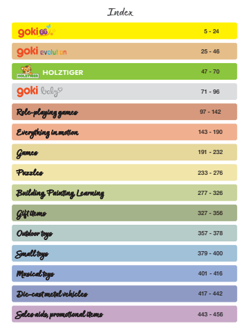 191 - 232379 - 40071 - 96233 - 276401 - 41647 - 7025 - 465 - 24277 - 326417 - 44297 - 142327 - 356443 - 456143 - 190357 - 378HOLZTIGERIndexRole-playing gamesEverything in motionGamesPuzzlesBuilding, Painting, LearningGift itemsOutdoor toysSmall toysMusical toysDie-cast metal vehiclesSales aids, promotional items