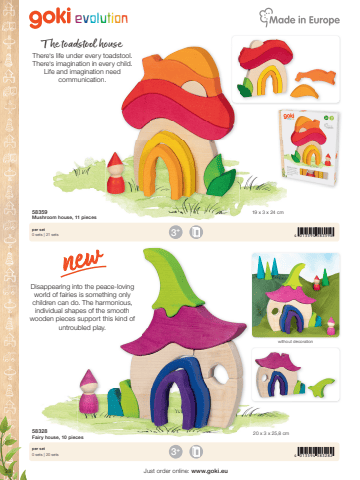 28evolution4 013594 5835964 013594 58328219 x 3 x 24 cm20 x 3 x 25,8 cm3+3+Just order online: www.goki.eu58359Mushroom house, 11 pieces58328Fairy house, 10 pieces per set0 sets | 21 setsper set0 sets | 20 setsDisappearing into the peace-loving world of fairies is something only children can do. The harmonious, individual shapes of the smooth wooden pieces support this kind of untroubled play.The toadstff l houseThere%u2018s life under every toadstool.There%u2018s imagination in every child.Life and imagination need communication.without decoration
