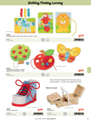 3014 013594 5838554 013594 5868633+3+3+ 3+4 013594 587846 4 013594 58415917 x 7 x 10,5 cm 22 x 13 x 15 cm13 x 11,2 x 0,2 cm12 x 16,5 cmJust order online: www.goki.euBuilding, Painting, Learning58385Threading set orchard, 3 motifs (apple, tree, butterfly), 3 cords58686Threading game, parrot, lion, zebra, 3 motifs, 6 cordsper set20 sets | 40 setsper set0 sets | 24 sets58415Sewing box58784Learn-to-lace shoeper piece4 pieces | 24 piecesper piece12 pieces | 36 piecesBeech woodThis is the final season for the sewing box, unfortunately - it won%u2018t be made any more.
