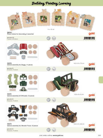 3054 4 013594 263016+4 013594 5837634 013594 5837494 013594 5837565+5+5+11 x 12 cm14,5 x 9 x 7,5 cm12,8 x 9 x 9 cm13,5 x 9 x 9,8 cmJust order online: www.goki.euBuilding, Painting, LearningSB301Photo frames for decorating, 6 assortedper set of 120 pieces | 240 pieces58376Vehicle assembly kit, Buggy, 11 pieces58374Vehicle assembly kit Offroader, 12 pieces58375Vehicle assembly kit, Monster Truck, 12 piecesper set of 336 pieces | 72 piecesper set of 336 pieces | 72 piecesper set of 336 pieces | 72 pieces