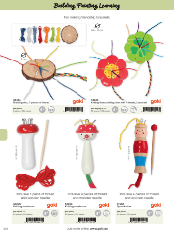 3064 013594 054270 4 013594 519632 4 013594 5196494+ 4+ 4+4+ 4+4 013594 584845 4 013594 5861609,5 - 10 cm7 cm%u00ef 11,5 cm %u00f0%u00ef 10,5 cm %u00f0%u00ef 10,5 cm %u00f0Just order online: www.goki.euBuilding, Painting, LearningGK427Knitting mushroom51963Knitting mushroom51964Spool knitterper set of 1260 pieces | 240 piecesper piece60 pieces | 120 piecesper piece60 pieces | 120 pieces58484Braiding disc, 7 pieces of thread58616Knitting flower, knitting clover with 7 threads, 2 assortedper piece0 pieces | 144 piecesper display of 1296 pieces | 192 piecesFor making friendship bracelets.Inclusive 4 pieces of thread and wooden needleInclusive 1 piece of thread and wooden needleInclusive 4 pieces of thread and wooden needle