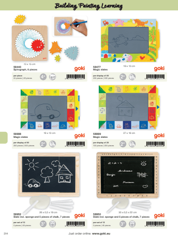 3144+ 2+2+ 2+3+ 3+4 013594 584401 4 013594 5847774 013594 589987 4 013594 5899944 013594 589529 4 013594 58950519 x 13 cm 13 x 13 cm19 x 13 cm 27 x 19 cm26 x 0,5 x 19 cm 30 x 0,5 x 22 cmJust order online: www.goki.euBuilding, Painting, Learning58440Spirograph, 6 pieces58477Magic slates58999Magic slates58998Magic slates58952Slate incl. sponge and 5 pieces of chalk, 7 pieces58950Slate incl. sponge and 5 pieces of chalk, 7 piecesper piece24 pieces | 48 piecesper display of 50250 pieces | 500 piecesper display of 20100 pieces | 200 piecesper display of 50250 pieces | 500 piecesper set of 120 pieces | 48 piecesper set of 120 pieces | 48 pieces
