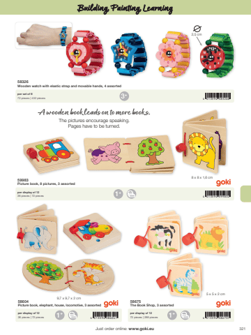 3211+ 1+4 013594 586047 4 013594 5867574 013594 5998324 013594 5832681+3+2,5 cm8 x 8 x 1,6 cm5 x 5 x 2 cm9,7 x 9,7 x 2 cmJust order online: www.goki.euBuilding, Painting, Learning58604Picture book, elephant, house, locomotive, 3 assorted58675The Book Shop, 3 assortedper display of 1236 pieces | 72 piecesper display of 1272 pieces | 288 pieces59983Picture book, 8 pictures, 3 assorted58326Wooden watch with elastic strap and movable hands, 4 assortedper display of 1236 pieces | 72 piecesper set of 872 pieces | 432 piecesA wooden book leads on to more book s.The pictures encourage speaking. Pages have to be turned.