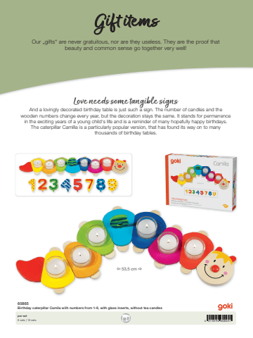 4 013594 608657%u00ef 53,5 cm %u00f060865Birthday caterpillar Camila with numbers from 1-9, with glass inserts, without tea candlesper set8 sets | 16 setsLove needs some tangible signs And a lovingly decorated birthday table is just such a sign. The number of candles and the wooden numbers change every year, but the decoration stays the same. It stands for permanence in the exciting years of a young child%u2018s life and is a reminder of many hopefully happy birthdays. The caterpillar Camilla is a particularly popular version, that has found its way on to many thousands of birthday tables.Our %u201egifts%u201c are never gratuitous, nor are they useless. They are the proof that beauty and common sense go together very well!Gift items