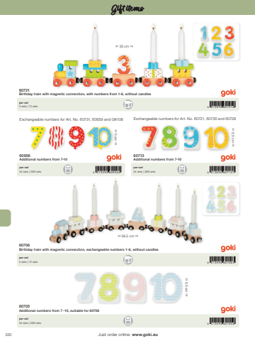 3304 013594 6072164 013594 6070634 013594 6070564 013594 609562 4 013594 607131%u00ef 35 cm %u00f0%u00ef 5 cm %u00f0%u00ef 5,5 cm %u00f0%u00ef 56,5 cm %u00f0%u00ef 5,5 cm %u00f0Just order online: www.goki.euGift items60721Birthday train with magnetic connection, with numbers from 1-6, without candles60706Birthday train with magnetic connection, exchangeable numbers 1-6, without candles60705Additional numbers from 7 - 10, suitable for 60706per set0 sets | 12 setsper set0 sets | 12 setsper set24 sets | 288 sets60956Additional numbers from 7-1060713Additional numbers from 7-10per set24 sets | 288 setsper set24 sets | 288 setsExchangeable numbers for Art. No. 60731, 60659 and GK108 Exchangeable numbers for Art. No. 60721, 60726 and 60728