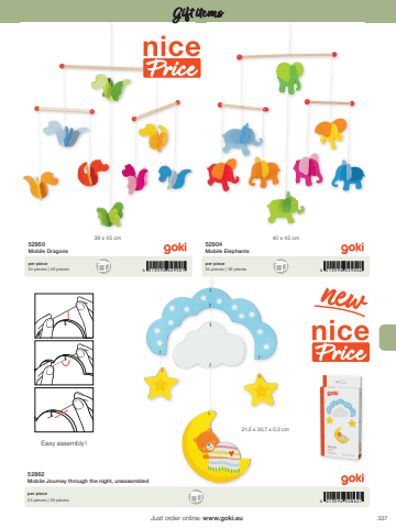 3374 013594 529501 4 013594 5290444 013594 52862739 x 45 cm 40 x 45 cm21,5 x 30,7 x 0,3 cmJust order online: www.goki.euGift items52950Mobile Dragons52904Mobile Elephantsper piece24 pieces | 48 piecesper piece24 pieces | 48 pieces52862Mobile Journey through the night, unassembledper piece24 pieces | 48 piecesEasy assembly !