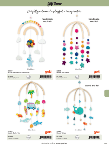 3394 013594 5286724 013594 5286584 013594 5286894 013594 52869625 x 30 cm25 x 46 cm 25 x 30 cm43 x 42 cmJust order online: www.goki.euGift items52867Mobile Elephant on the journey52865Mobile Surfer Van52868Mobile Star dance52869Mobile Whaleper piece12 pieces | 24 piecesper piece8 pieces | 16 piecesper piece8 pieces | 16 piecesper piece8 pieces | 16 piecesBrightly coloured - playful - imaginative Wood and felthandmadewool felthandmadewool felt