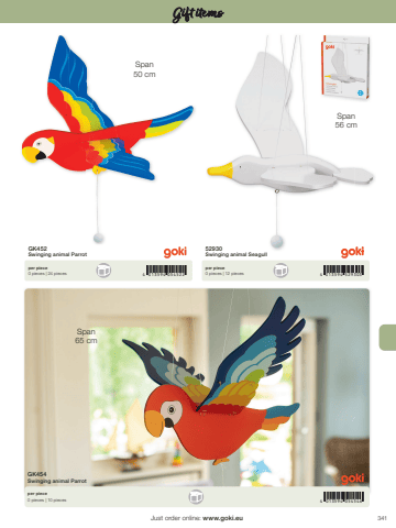 3414 013594 054522 4 013594 5293034 013594 054546Just order online: www.goki.euGift itemsGK452Swinging animal Parrot52930Swinging animal Seagullper piece0 pieces | 24 piecesper piece0 pieces | 12 piecesGK454Swinging animal Parrotper piece0 pieces | 10 piecesSpan50 cmSpan56 cmSpan65 cm