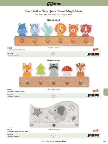 3434 013594 6073774 013594 6066224 013594 60689940 x 4,5 x 11,5 cm32,5 x 5,5 x 11,5 cm29 x 15,6 x 4,6 cmJust order online: www.goki.euGift items60737Coat rack, elephant and stars60662Coat rack, forest friends60689Coat rack, animal friendsper piece16 pieces | 32 piecesper piece10 pieces | 20 piecesper piece10 pieces | 20 piecesBeech woodBeech woodThree best-sellers: from the world of tidiness. We were a bit surprised too, but pleased.