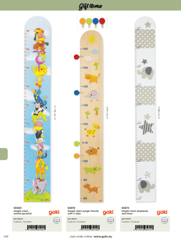 3464 013594 609203 4 013594 609166 4 013594 606745%u00ef 100 cm %u00f0%u00ef 91 cm %u00f0%u00ef 98 cm %u00f0Just order online: www.goki.euGift items60920Height chart,animal pyramid 60916Height chart jungle friends,with 4 clips60674Height chart elephantsand starsper piece8 pieces | 16 piecesper piece6 pieces | 18 piecesper piece8 pieces | 16 pieces