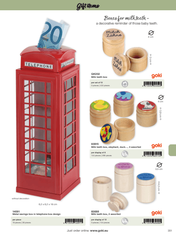 3514 013594 140911 4 013594 6068824 013594 6091594 013594 0520236,2 x 6,2 x 18 cm4 cm%u00ef 3 cm %u00f04 cm%u00ef 3,9 cm %u00f03,5 cm%u00ef 4,5 cm %u00f0Just order online: www.goki.euGift items14091Metal savings box in telephone box designper piece18 pieces | 36 pieces60688Milk teeth box, 2 assorted60915Milk teeth box, elephant, duck%u2026, 4 assortedGK202Milk teeth boxper display of 120 pieces | 144 piecesper display of 8144 pieces | 288 piecesper set of 120 pieces | 432 pieceswithout decorationBoxes for milk teeth - a decorative reminder of those baby teeth.