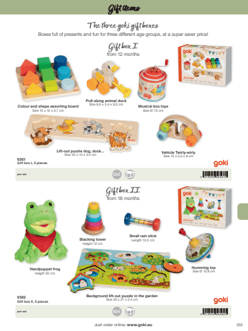 3554 013594 0658254 013594 06561018m+12m+Just order online: www.goki.euGift items6582Gift box II, 5 pieces6561Gift box I, 5 piecesper setper setThe three goki gift boxes Boxes full of presents and fun for three different age groups, at a super saver price!Gift box Ifrom 12 monthsGift box IIfrom 18 monthsVehicle Twirly-wirlySize 12 x 5,5 x 8 cmHandpuppet frogHeight 30 cmBackground lift-out puzzle in the gardenSize 30 x 21 x 2,4 cmStacking towerHeight 12 cmSmall rain stickLength 12,2 cmHumming topSize %u00d8 12,8 cmColour and shape assorting boardSize 15 x 15 x 3,7 cmPull-along animal duckSize 8,5 x 5,4 x 9,3 cmLift-out puzzle dog, duck...Size 30 x 10 x 2,4 cmMusical box toysSize %u00d8 7,5 cm