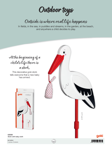 4 013594 639361%u00ef 77 cm %u00f063936Stork with baby clothper piece0 pieces | 8 piecesOutdoor toysOutside is where real life happensIn fi elds, in the sea, in puddles and streams, in the garden, at the beach, and anywhere a child decides to play.At the beginning of a child%u2018s life there is a stork.This decorative goki stork tells everyone that a new baby has arrived.