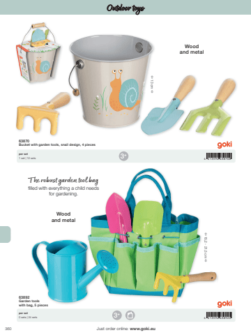 3604 013594 6387084 013594 6389203+3+%u00ef 13 cm %u00f0%u00ef 15,2 - 21,5 cm %u00f0Just order online: www.goki.euOutdoor toys63870Bucket with garden tools, snail design, 4 pieces63892Garden tools with bag, 5 piecesper set1 set | 12 setsper set0 sets | 24 setsWoodand metalWoodand metalThe robust garden tool bagfilled with everything a child needs for gardening.