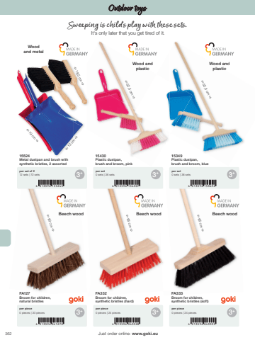 362%u00ef90 cm %u00f0%u00ef65 cm %u00f0%u00ef65 cm %u00f04 013594 0412704 013594 1552434 013594 0433284 013594 1543074 013594 0433354 013594 1534923+3+3+3+3+3+%u00ef 13 cm %u00f0%u00ef 19 cm %u00f0%u00ef52,5 cm %u00f0%u00ef52,5 cm %u00f0%u00ef18,5 cm %u00f0Just order online: www.goki.euOutdoor toysFA127Broom for children, natural bristles15524Metal dustpan and brush with synthetic bristles, 2 assortedFA332Broom for children, synthetic bristles (hard)FA333Broom for children, synthetic bristles (soft)15430Plastic dustpan, brush and broom, pink15349Plastic dustpan, brush and broom, blueper piece0 pieces | 30 piecesper set of 212 sets | 72 setsper piece0 pieces | 24 piecesper set0 sets | 36 setsper piece0 pieces | 24 piecesper set0 sets | 36 setsWoodand metalBeech wood Beech wood Beech woodWood andplasticWood andplasticSwffi ping is child%u2018s play with these sets. It%u2018s only later that you get tired of it.