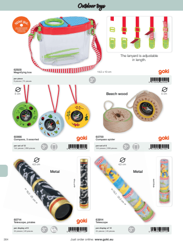 3643 4 013594 629287+3+3+3+3+4 013594 6086644 013594 6071484 013594 6070014 013594 63914914,5 x 10 cm5 cm 5 cm%u00ef 18,5 - 25 cm %u00f04,5 cm%u00ef 19,3 - 25,3 cm %u00f04,5 cmJust order online: www.goki.euOutdoor toys62928Magnifying boxper piece9 pieces | 72 pieces60866Compass, 3 assorted60714Telescope, pirates60700Compass spider63914Telescopeper set of 12144 pieces | 288 piecesper display of 624 pieces | 48 piecesper set of 6144 pieces | 288 piecesper display of 1224 pieces | 48 piecesThe lanyard is adjustable in length.Beech woodMetal Metal