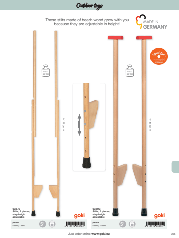 3655+ 5+4 013594 638722 4 013594 638937%u00ef 115 cm %u00f0%u00ef 177 cm %u00f0max.50 kgmax.50 kgJust order online: www.goki.euOutdoor toys63872Stilts, 2 pieces, step height adjustable63893Stilts, 2 pieces, step height adjustableper set0 sets | 7 setsper set0 sets | 15 setsThese stilts made of beech wood grow with you because they are adjustable in height !