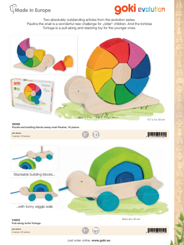 35evolution3 4 013594 583688+1 4 013594 548595+17,7 x 3 x 12 cm18,9 x 8 x 10 cmJust order online: www.goki.eu58368Puzzle and building blocks sassy snail Pauline, 10 piecesper piece0 pieces | 30 pieces54859Pull-along turtle Tortugaper piece0 pieces | 20 pieces...with funny wiggle walkStackable building blocks...Two absolutely outstanding articles from the evolution series. Pauline the snail is a wonderful new challenge for %u201eolder%u201c children. And the tortoise Tortuga is a pull-along and stacking toy for the younger ones.