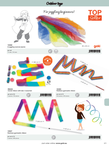 3713+ 3+4 013594 434003 4 013594 1535393 4 013594 155274+4 4 013594 153829+%u00ef 360 cm %u00f03,7 cm%u00ef 200 cm %u00f0%u00ef 40 cm %u00f0%u00ef 200 cm %u00f0%u00ef 40 cm %u00f066 x 66 cmJust order online: www.goki.euOutdoor toysFB400Comet ribbon with ball, 4 assorted15353Rainbow gymnastic ribbonper set of 240 pieces | 192 piecesper set of 12240 pieces | 480 pieces15527Rainbow gymnastic ribbonper set of 120 pieces | 288 pieces153826 juggling scarves (nylon)per set12 sets | 120 setsFor juggling beginners!