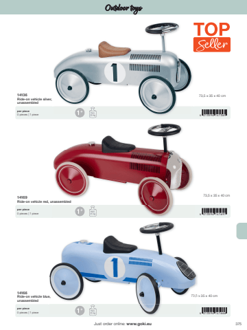 3754 013594 1416664 013594 1416974 013594 1413691+1+1+max.25 kgmax.25 kgmax.25 kg73,5 x 35 x 40 cm1+ max.73,5 x 35 x 40 cm1+ max.25 kg73,5 x 35 x 40 cm1 25 kg+ max.Just order online: www.goki.euOutdoor toys14166Ride-on vehicle blue, unassembled14169Ride-on vehicle red, unassembled14136Ride-on vehicle silver,unassembledper piece0 pieces | 1 pieceper piece0 pieces | 1 pieceper piece0 pieces | 1 piece