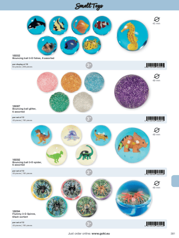 3814 013594 1609404 013594 1609264 013594 1608724 013594 1600253+3+3+3+49 mm45 mm49 mm49 mmJust order online: www.goki.euSmall Toys16087Bouncing ball glitter, 6 assorted16092Bouncing ball 3-D spider, 6 assorted16094Flummy 3-D Spinne,6fach sortiert16002Bouncing ball 3-D fishes, 8 assortedper set of 1248 pieces | 192 piecesper set of 1248 pieces | 192 piecesper set of 1248 pieces | 192 piecesper display of 1664 pieces | 256 pieces