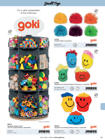 3834 013594 669146 4 013594 2108054 013594 6296524 013594 1557623+3+3+40 cm4 cm8 cm6 cmJust order online: www.goki.euSmall Toys66914Rotating display stand with 24 compartments, assembledper piece0 pieces | 1 piecePE080Squeeze-me stretchy balloon faces, 3 assorted62965Squeeze-me stretchy balloon funny face, 4 assorted15576PomPom Ball, 6 assortedper display of 1236 pieces | 72 piecesper display of 3090 pieces | 180 piecesper set of 120 pieces | 144 pieceswithout decorationFor a clear presentation of the small toys.