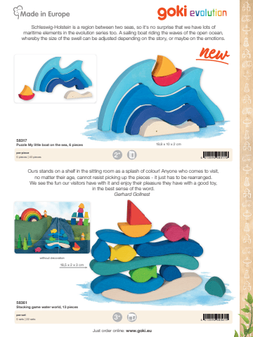 37evolution2 4 013594 583176+18,5 x 2 x 3 cm3 4 013594 583619+19,8 x 10 x 2 cmJust order online: www.goki.eu58317Puzzle My little boat on the sea, 6 pieces per piece0 pieces | 40 pieces58361Stacking game water world, 13 piecesper set0 sets | 22 setsOurs stands on a shelf in the sitting room as a splash of colour! Anyone who comes to visit, no matter their age, cannot resist picking up the pieces - it just has to be rearranged. We see the fun our visitors have with it and enjoy their pleasure they have with a good toy, in the best sense of the word. Gerhard GollnestSchleswig-Holstein is a region between two seas, so it%u2018s no surprise that we have lots of maritime elements in the evolution series too. A sailing boat riding the waves of the open ocean, whereby the size of the swell can be adjusted depending on the story, or maybe on the emotions.without decoration