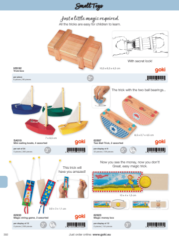 3923+3+4 013594 4001904 013594 6292324 013594 6289764 013594 6293005+3+3 4 013594 091923+10,5 x 6,5 x 4,5 cm7 x 6,5 cm8,5 x 2,7 x 4,5 cm9,8 x 3 x 1,1 cm10 x 4 x 1,5 cmJust order online: www.goki.euSmall ToysSA019Mini sailing boats, 4 assorted62923Magic money boxper set of 240 pieces | 360 piecesper display of 120 pieces | 144 pieces62897Two Ball Trick, 2 assorted62930Magic string game, 2 assortedper display of 832 pieces | 128 piecesper display of 120 pieces | 288 piecesHS192Trick-boxper piece6 pieces | 96 piecesJust a lit tle magic required.All the tricks are easy for children to learn.With secret lock!The trick with the two ball bearings...This trick will have you amazed!Now you see the money, now you don%u2019t! Great, easy magic trick.