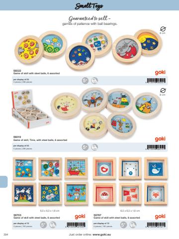 3944 013594 5602214 013594 5601915+5+5 4 013594 567039 4 013594 567671+ 5+8 cm8 cm6,5 x 6,5 x 1,8 cm 6,5 x 6,5 x 1,8 cmJust order online: www.goki.euSmall Toys56022Game of skill with steel balls, 6 assorted56019Game of skill, Tinis, with steel balls, 6 assortedper display of 240 pieces | 288 piecesper display of 240 pieces | 288 pieces56703Game of skill with steel balls, 6 assorted56767Game of skill with steel balls, 6 assortedper display of 120 pieces | 192 piecesper display of 120 pieces | 192 piecesGuaranteed to sell - games of patience with ball bearings.