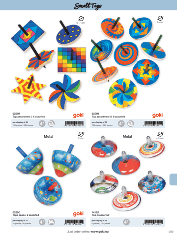 3994 013594 6289074 013594 6299424 013594 1418574 013594 6299114+4+4+4+6 - 7 cm 6 cm5 cm 4,5 cmJust order online: www.goki.euSmall Toys62890Tops space, 2 assorted62994Top assortment I, 6 assorted14185Top, 6 assorted62991Top assortment II, 8 assortedper display of 1224 pieces | 96 piecesper display of 24144 pieces | 288 piecesper display of 160 pieces | 720 piecesper display of 32192 pieces | 384 piecesMetal Metal