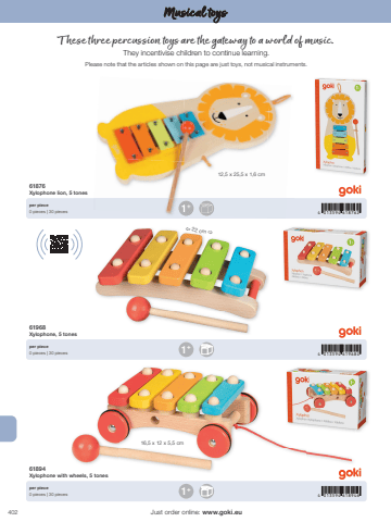 4024 013594 6189464 013594 6196844 013594 6187621+1+1+12,5 x 25,5 x 1,6 cm%u00ef 22 cm %u00f016,5 x 12 x 5,5 cmJust order online: www.goki.euMusical toys61894Xylophone with wheels, 5 tones61968Xylophone, 5 tones61876Xylophone lion, 5 tonesper piece0 pieces | 30 piecesper piece0 pieces | 30 piecesper piece0 pieces | 30 piecesThese three percussion toys are the gateway to a world of music.They incentivise children to continue learning.Please note that the articles shown on this page are just toys, not musical instruments.
