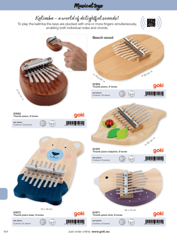 4045+5+5+5+ 5+4 013594 6195304 013594 6197524 013594 6186254 013594 618724 4 013594 618717%u00ef 6,8 cm %u00f012 x 19 cm%u00ef 20 cm %u00f0%u00ef 13,5 cm %u00f0%u00ef 22 cm %u00f018 x 15 cmJust order online: www.goki.euMusical toys61953Thumb piano, 8 tones61975Thumb piano ladybird, 8 tones61862Thumb piano, 8 tones61871Thumb piano bird, 8 tones61872Thumb piano bear, 8 tonesper piece6 pieces | 36 piecesper piece6 pieces | 24 piecesper piece0 pieces | 100 piecesper piece6 pieces | 24 piecesper piece6 pieces | 24 piecesKalimba - a world of delightful sounds!To play the kalimba the keys are plucked with one or more fingers simultaneously, enabling both individual notes and chords.Beech wood