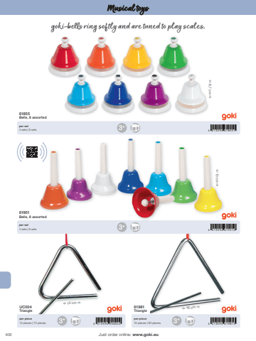 406%u00ef 16 cm %u00f0%u00ef 10 cm %u00f04 013594 6185574 013594 6195163+3+3+ 3+4 013594 350044 4 013594 619813%u00ef 8,7 cm %u00f0%u00ef 13 cm %u00f0Just order online: www.goki.euMusical toys61855Bells, 8 assorted61951Bells, 8 assortedper set4 sets | 8 setsper set4 sets | 8 sets61981TriangleUC004Triangleper piece10 pieces | 60 piecesper piece12 pieces | 72 piecesgoki-befi s ring softly and are tuned to play scales.