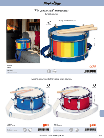 4133+ 3+3+4 013594 140157 4 013594 1401334 013594 619196%u00ef 13,5 cm %u00f021,5 cm28 cm 28 cm%u00ef 14 cm %u00f0%u00ef 14 cm %u00f0Just order online: www.goki.euMusical toys14015Snare drum14013Snare drum61919Drumper piece0 pieces | 4 piecesper piece0 pieces | 4 piecesper piece4 pieces | 8 piecesMarching drums with the typical snare sound...For %u201eadvanced%u201c drummers: tunable drums!Body made of wood
