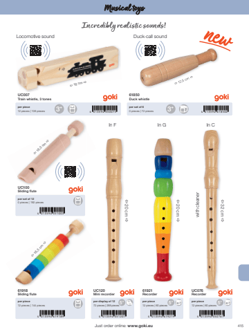 4153+ 3+4 013594 350075 4 013594 6185024 013594 619189 4 013594 351201 4 013594 619219 4 013594 3507614 013594 3510035+ 5+ 5+%u00ef 12,5 cm %u00f0%u00ef 18 cm %u00f0%u00ef 16,5 cm %u00f0%u00ef 16,5 cm %u00f0%u00ef 32 cm %u00f0%u00ef 20 cm %u00f0%u00ef 20 cm %u00f0Just order online: www.goki.euMusical toysUC007Train whistle, 3 tones61850Duck whistleper piece12 pieces | 108 piecesper set of 60 pieces | 72 piecesUC076Recorder61921RecorderUC120Mini recorder61918Sliding fluteUC100Sliding fluteper piece12 pieces | 60 piecesper piece12 pieces | 60 piecesper display of 1272 pieces | 288 piecesper piece12 pieces | 144 piecesper set of 120 pieces | 192 piecesIncredibly realistic sounds!Duck-call soundIn F In G In CLocomotive soundwith cleaner