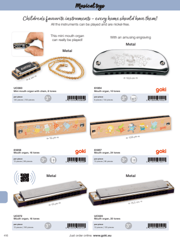 4164 013594 3507234 013594 3508083 4 013594 350204+3+3+3+ 3+3+4 013594 618588 4 013594 6185714 013594 619547%u00ef 4 cm %u00f0%u00ef 10,5 cm %u00f0%u00ef 13 cm %u00f0%u00ef 17,6 cm %u00f0%u00ef 13 cm %u00f0%u00ef 15,5 cm %u00f0Just order online: www.goki.euMusical toysUC072Mouth organ, 16 tonesUC080Mini mouth organ with chain, 8 tonesUC020Mouth organ, 20 tonesper piece12 pieces | 180 piecesper piece120 pieces | 720 piecesper piece12 pieces | 120 pieces61858Mouth organ, 16 tones61857Mouth organ, 24 tones61954Mouth organ, 10 tonesper piece12 pieces | 96 piecesper piece12 pieces | 96 piecesper piece6 pieces | 144 piecesChildren%u2018s favourite instruments - every home should have them!All the instruments can be played and are nickel-free.This mini mouth organ can really be played! MetalMetalMetal MetalWith an amusing engraving