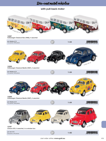 4194 013594 1208764 013594 1209994 013594 1208834 013594 1218733+3+3+3+ 1 : 601 : 641 : 641 : 64%u00ef 6,5 cm %u00f0%u00ef 6,5 cm %u00f0%u00ef 6,5 cm %u00f0%u00ef 7,6 cm %u00f0Just order online: www.goki.euDie-cast metal vehicleswith pull-back motor12087Volkswagen Classical Bus (1962), 4 assorted12099Volkswagen Classical Beetle (1967), 4 assorted12088Volkswagen Classical Beetle (1967), 4 assorted12187Citroen 2CV, 4 assorted, in a window boxper display of 12144 pieces | 288 piecesper display of 12144 pieces | 288 piecesper display of 12144 pieces | 288 piecesper set of 1236 pieces | 216 pieces