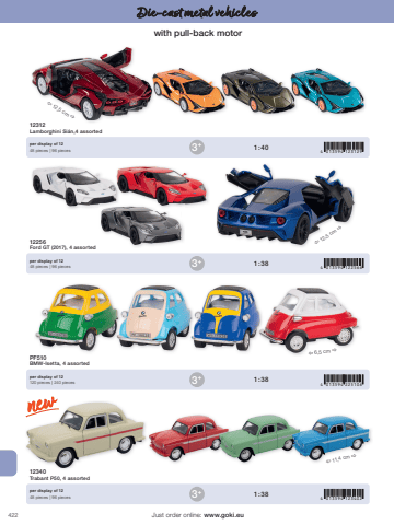 4224 013594 1231294 013594 1225664 013594 2251064 013594 1234023+3+3+3+ 1 : 381 : 381 : 381 : 40%u00ef 12,5 cm %u00f0%u00ef 12,5 cm %u00f0%u00ef 6,5 cm %u00f0%u00ef 11,4 cm %u00f0Just order online: www.goki.euDie-cast metal vehicleswith pull-back motor12312Lamborghini Si%u00e1n,4 assorted12256Ford GT (2017), 4 assortedPF510BMW-Isetta, 4 assorted12340Trabant P50, 4 assortedper display of 1248 pieces | 96 piecesper display of 1248 pieces | 96 piecesper display of 12120 pieces | 240 piecesper display of 1248 pieces | 96 pieces