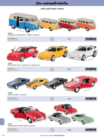 4244 013594 2297604 013594 1218594 013594 1229004 013594 1213923+3+3+3+ 1 : 361 : 371 : 371 : 37%u00ef 11,5 cm %u00f0%u00ef 12,8 cm %u00f0%u00ef 11,5 cm %u00f0%u00ef 12 cm %u00f0Just order online: www.goki.euDie-cast metal vehicleswith pull-back motorPF976Volkswagen Classical Bus T1 (1963), 4 assorted12185Porsche 964 Turbo, 3 assorted, in a window box12290Camaro Z (1967), 4 assorted12139Mercedes-Benz 190SL (1955), 4 assortedper display of 1248 pieces | 96 piecesper set of 1224 pieces | 96 piecesper display of 1236 pieces | 72 piecesper display of 1248 pieces | 96 pieces