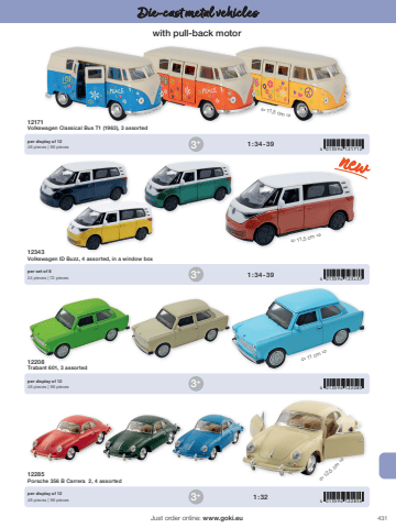 4314 013594 1217124 013594 1234334 013594 1220854 013594 1228563+3+3+3+1 : 34 - 391 : 34 - 391 : 32%u00ef 11,5 cm %u00f0%u00ef 11 cm %u00f0%u00ef 12,5 cm %u00f0%u00ef 11,5 cm %u00f0Just order online: www.goki.euDie-cast metal vehicleswith pull-back motor12171Volkswagen Classical Bus T1 (1963), 3 assorted12343Volkswagen ID Buzz, 4 assorted, in a window box12208Trabant 601, 3 assorted12285Porsche 356 B Carrera 2, 4 assortedper display of 1248 pieces | 96 piecesper set of 824 pieces | 72 piecesper display of 1248 pieces | 96 piecesper display of 1248 pieces | 96 pieces